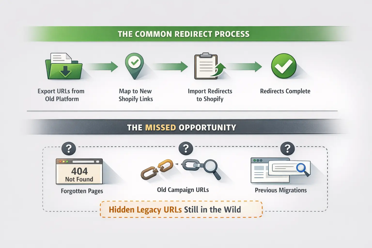 This gap usually isn’t visible at launch. In many migrations, the Shopify storefront, checkout, and catalog go live without issues. The bulk of 404 errors begin appearing days to weeks later, once customers, search engines, and external sites attempt to access long-forgotten paths.